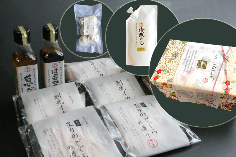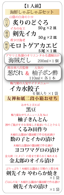 | 原材料 | 【具材】 ・剣先イカ(萩産)・のどぐろ(山口県産)・モロトゲアカエビ(萩産) ・イカ水餃子( 野菜(キャベツ(国産)、ニラ、ねぎ、しょうが)、豚肉(国産)、いか、豚脂、砂糖、海賊だし、醤油、中華用調味料、オイスターソース(オイスターエキス、砂糖、食塩、黒蜜)、食塩、こしょう、皮(小麦粉(国内製造)、食塩)/調味料(アミノ酸等)、(一部に豚肉・鶏肉・牛肉・ごま・いか・大豆・小麦・乳成分・ゼラチンを含む)) ・海賊だし( あさりだし(中国産),魚醤油(イワシ・塩・砂糖),食塩,生姜,酵母エキス ) ・葱だれ( 食用ごま油(国内製造),しょうゆ,醸造酢,魚醤,ラー油,葱(一部に小麦・大豆・ごまを含む) ) ・はちみつ柚子ポン酢( 醤油(国内製造),柚子果汁,本みりん,蜂蜜,清酒,昆布・炒り子,椎茸/酒精(一部に小麦大豆を含む) ) 【おせち惣菜】 ・黒豆( 黒豆(国内産),砂糖,塩、醤油(一部に小麦・大豆・ごまを含む) ) ・柚子きんとん( サツマイモ(国内産),砂糖,本みりん,柚子酢,塩,柚子皮,クチナシ ) ・くるみ田作り( いりこ(国内産),胡桃,海賊だし(あさりだし(国産),魚醤油(イワシ・塩・砂糖),食塩,生姜,酵母エキス),本味醂,山椒,水飴,料理酒, ) ・数の子イカの漬け( 数の子(カナダ産),剣先イカ,人参,昆布,醤油(大豆・小麦を含),本みりん,酒米,日本酒,糀,酢,ごま油,炒り子 /アルコール ) ・ヨコワマグロの漬け(ヨコワマグロ(萩産)、醤油【木桶仕込み醤油】(大豆・小麦を含)、純米本味醂、酒米、純米酒、糀、純米酢、胡麻油【玉搾り金胡麻油】、昆布、炒り子 /アルコール) ・金太郎オイル漬け(金太郎(萩産)、食用ひまわり油、オリーブオイル、塩、にんにく、胡椒) ・剣先イカやわらか焼き(剣先イカ(萩産)、醤油【木桶仕込み醤油】(大豆・小麦を含)、甘糀、甜菜糖、純米本味醂、食用米油、魚醤だし(鰯・アサリ出汁・塩・昆布・生姜・酵母エキス)、純米米酢、純米酒) ・剣先イカの漬け(剣先イカ(萩産)、醤油【木桶仕込み醤油】(大豆・小麦を含)、純米本味醂、酒米、純米酒、糀、純米酢、胡麻油【玉搾り金胡麻油】、昆布、炒り子 /アルコール) |