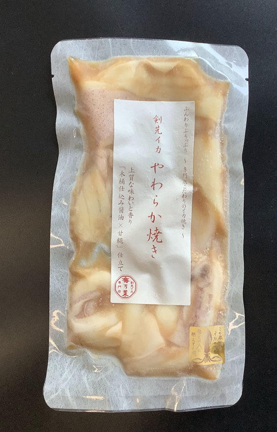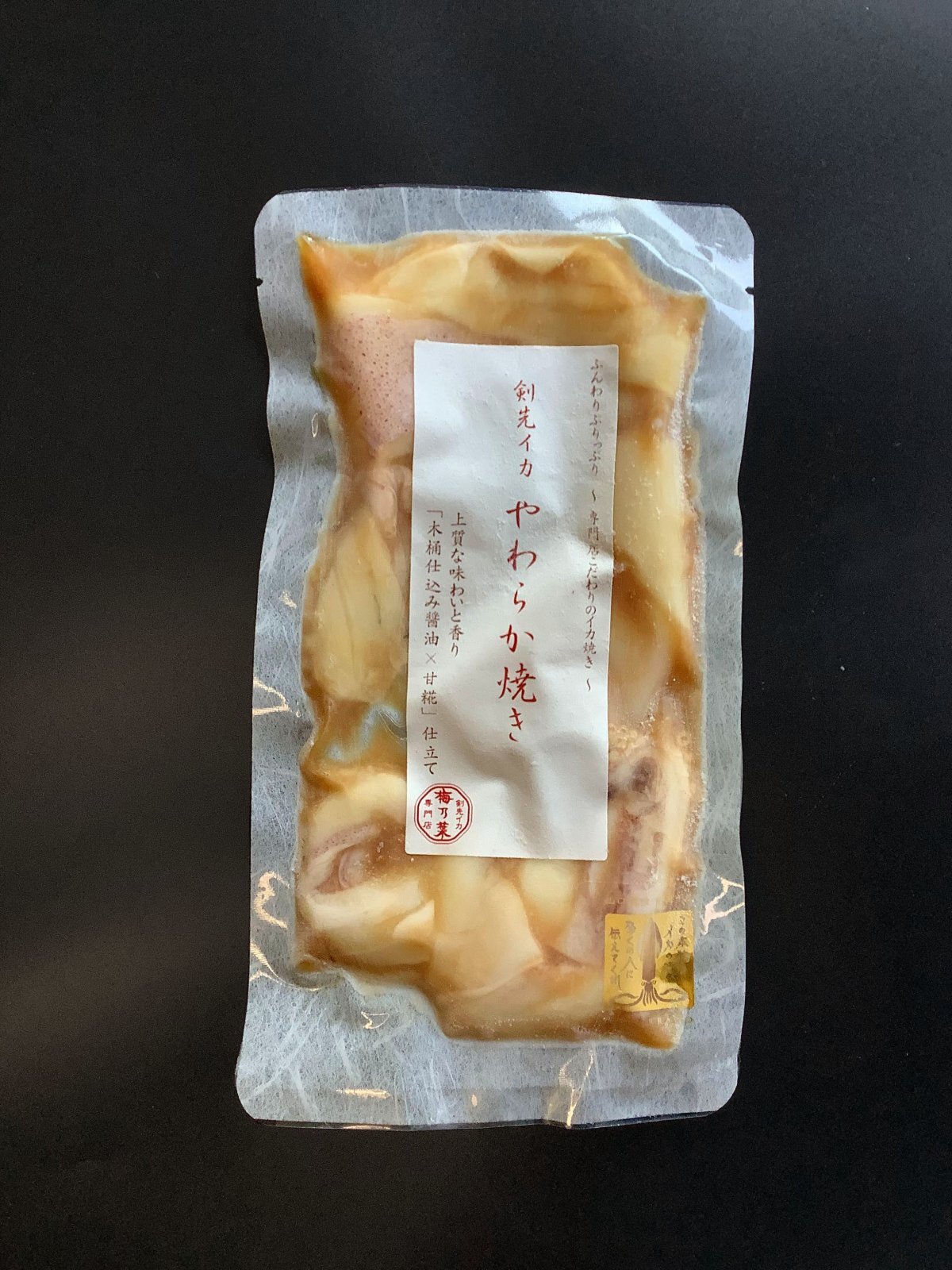 木桶仕込み醤油と甘糀で漬けた剣先イカのイカ焼きです。ご家庭で焼いた時の柔らかさを実感して頂けるよう、焼き方ガイドを同梱しております。袋ごと流水解凍した後、オーブントースターで是非、剣先イカのプリップリ・ふわっふわの身をご堪能ください。